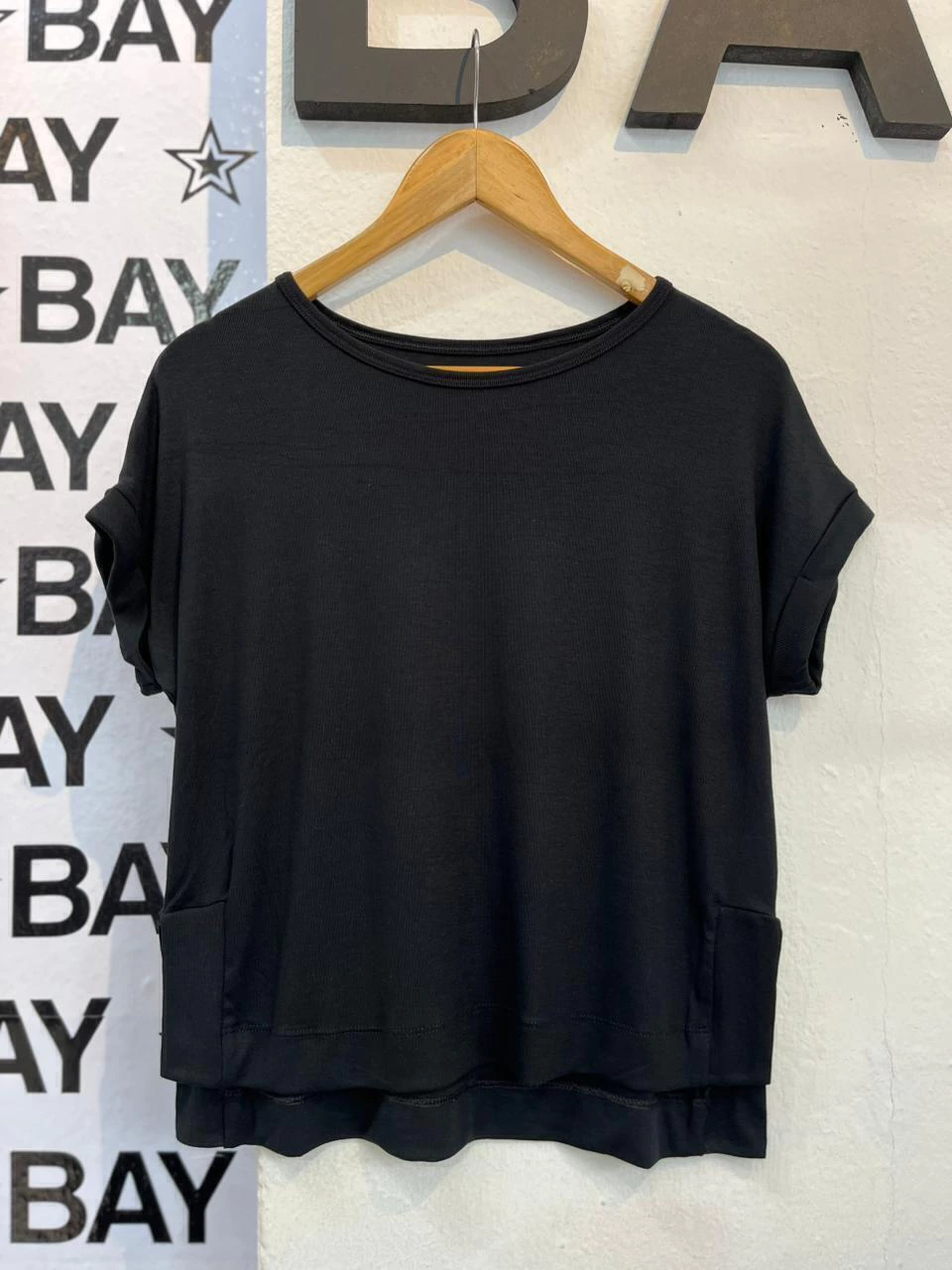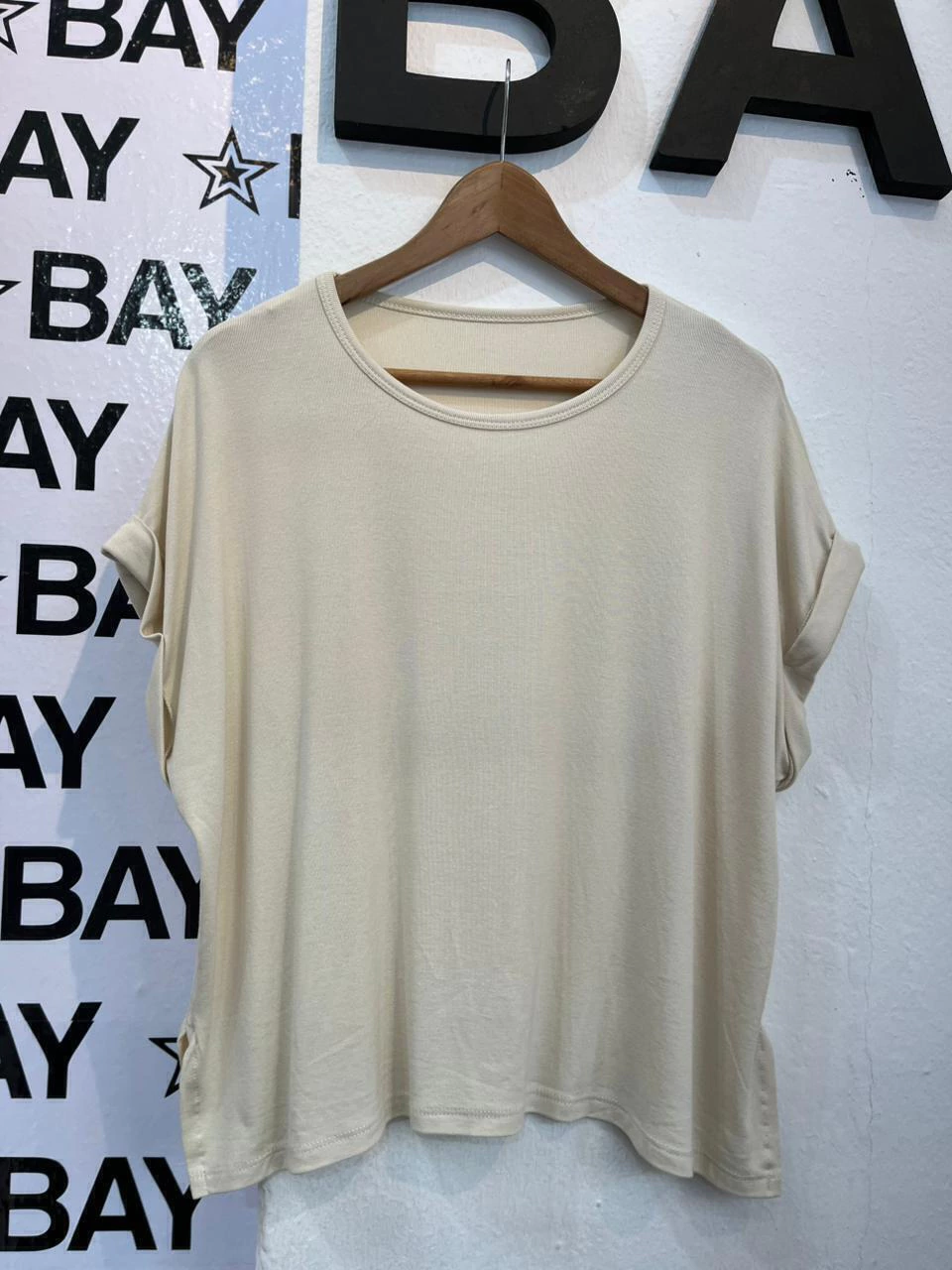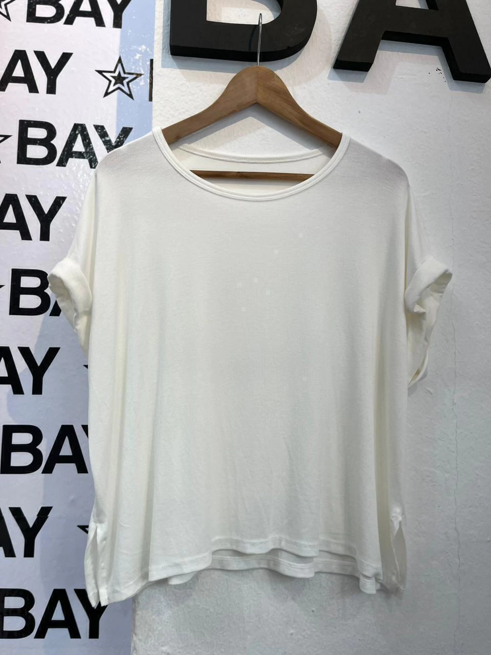 Remera de modal cuello redondo con pinzas en las mangas y tajos a los costados talle unico